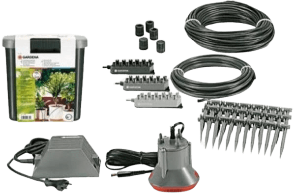 Трансформатор с таймером,насос с фильтром,3 распределителя по 12 выходов,9м шланга,капилл.трубочки 30м,36 колышков-держателей,20 заглушек,емкость 9 л |